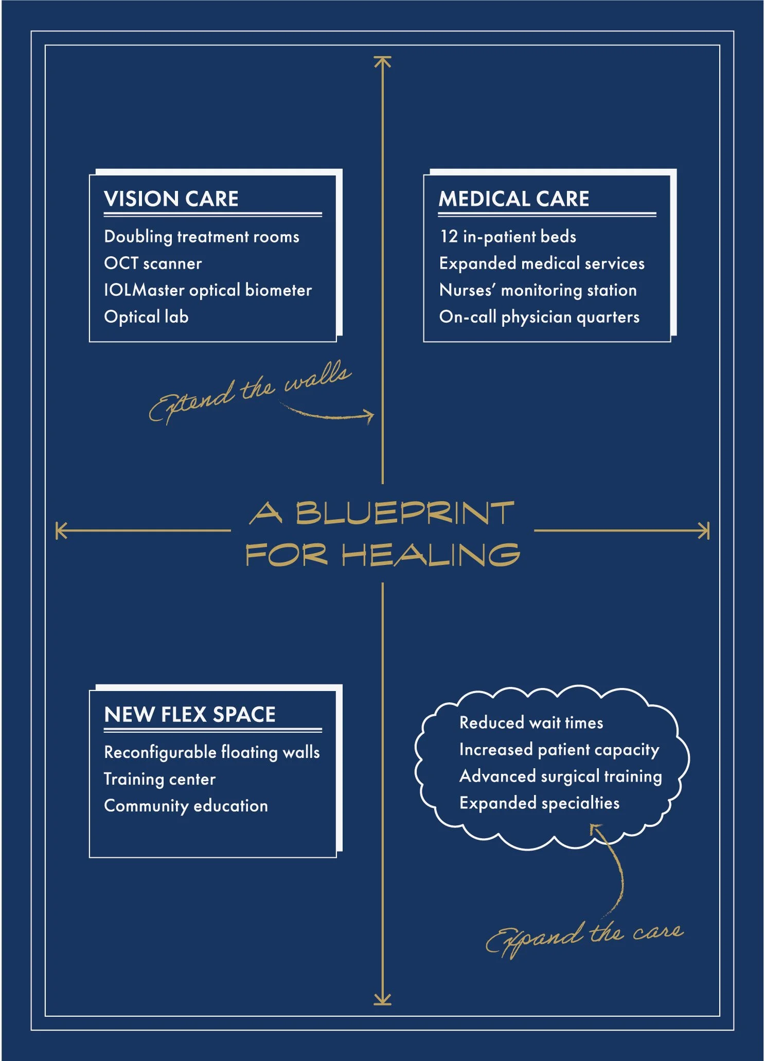 Your attendance will help extend the walls and expand the care through construction and equipping of a new multipurpose building that adds overnight-patient capacity; doubles treatment rooms for vision care, adds advanced equipment and and a lens grinding lab; and provides space for new medical services, professional development and specialized training. This expansion will not only transform our existing medical campus but more important, the lives of those in need.