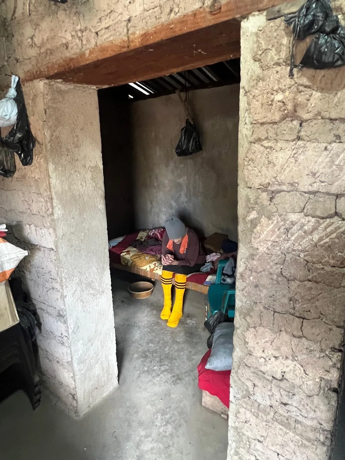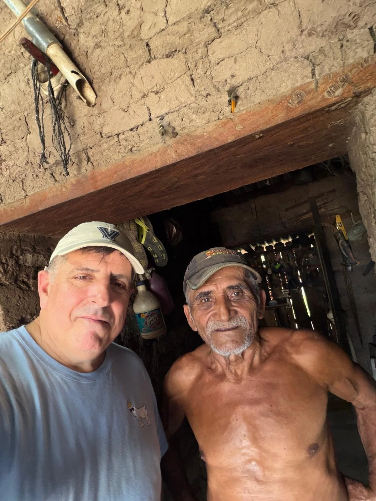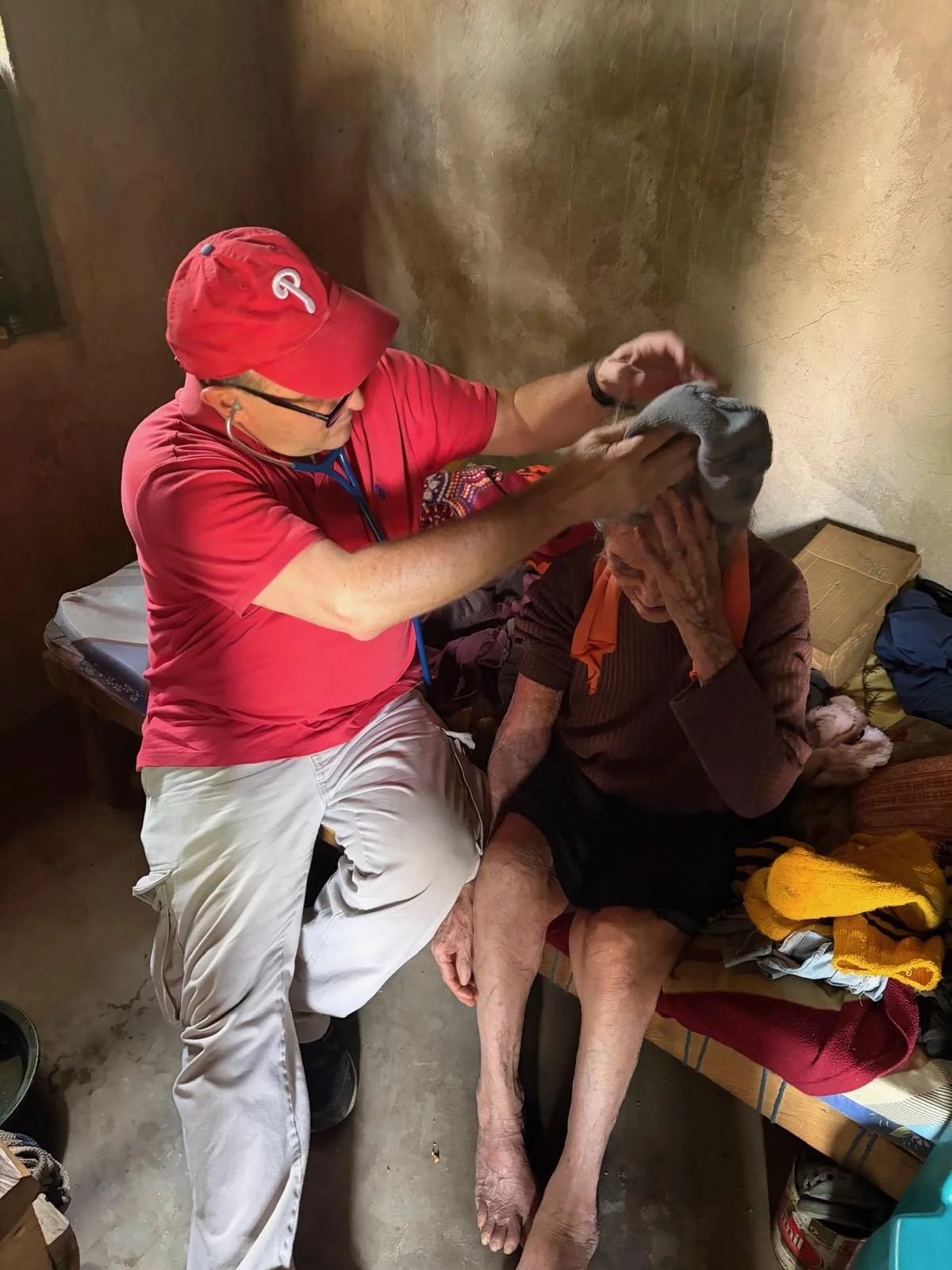 Her son, 79 years old, was there caring for her. A strong, shirtless man of the mountains, he was doing everything he could for his mother in a home with a wood-burning stove and little else.